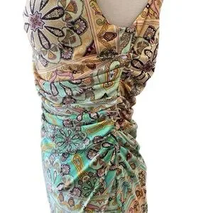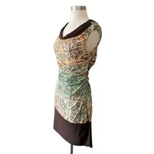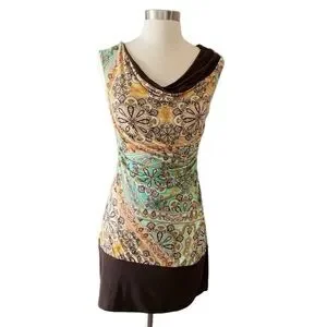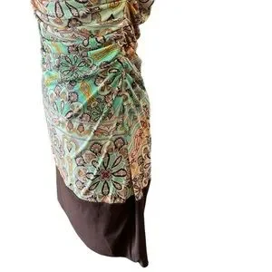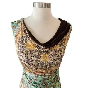 Features a draped cowl neckline, a gorgeous multicolored floral/paisley print, a bodycon style with ruching detail and a good amount of stretch. Lined with brown material that peaks through the top. 96% polyester, 4% spandex. Excellent preowned condition, no flaws.