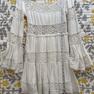 FREE PEOPLE White Crochet Lace Tiered Mini Dress Long Bell Sleeves 4