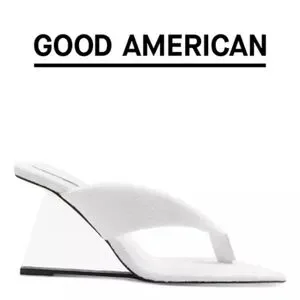 Elevate your shoe collection with these stylish Good American high heel wedge sandals. The thong style design, slip-on closure, and comfortable terry upper material make these sandals the perfect addition to any summer outfit. The white color and clear wedge heel add a touch of sophistication and elegance.