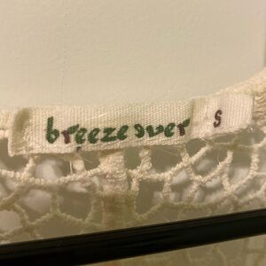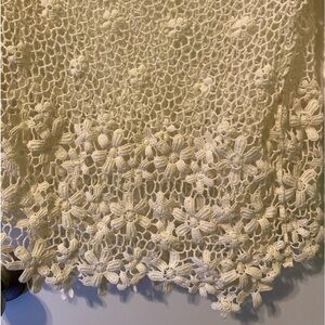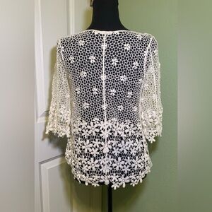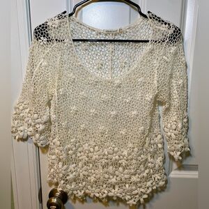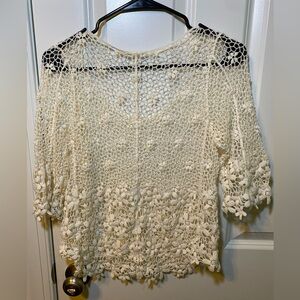 Beautiful crochet top with a floral design on the sleeves and at the bottom.