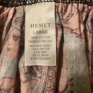 NWOT Hemet burnt orange/red pleated skirt with 2.5” elastic waist band. Has multiple “dark” patterns including black widow and web, skull, crows, and cameo. Unstretched waist band approx. 15.5” and waist to bottom approx. 20”. 100% cotton size L.