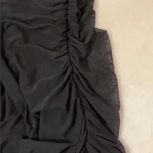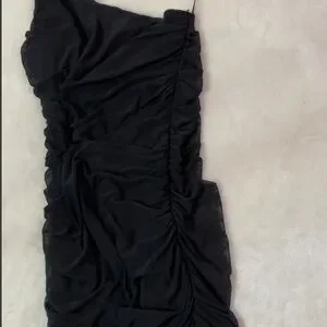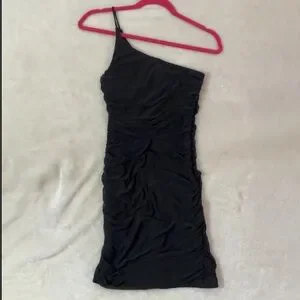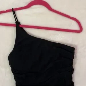 never been worn- still has the original tags attached. mini dress, bodycon, one shoulder (fixed shoulder strap, not adjustable). mesh overlay, fully lined, ruched material on both sides of the dress- slight stretch to the material. invisible side zip fastening (pictured). 30.3” (inches) in length- measured from shoulder to hem. 95% polyester and 5% elastane. basic, staple piece in a girls closet is a little black dress. sexy, comfortable, & cute. Size US 4