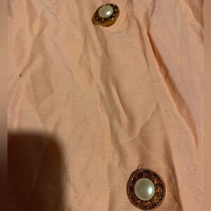 As a plus size girl I have to tell you how hard it is to find vintage plus size clothing so when I see them I get so excited this is a new with tags 80s dress. It is a pink-ish salmon color with a beautiful white lace bib detail the white is very white and not yellow or dingy at all, there is a attached belt that was original. The buttons are pearl and they’re on the front for decoration and they do not open and the ones on the back do button open. There are no rips, stains or tears. This comes from a very clean home with no pets and no smoking, the back has an elastic waist that is hidden by the belt overall it’s just a beautiful workmanship of the finest 80s clothing and of course last but not least adorned with shoulder pads of course