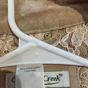 Coldwater Creek Leather/Suede Floral Embroidered Zip Vest. Lace interior and around edges of neck, sleeve opening, front and bottom hem. Color is Light Brown. Size Medium. Stitched designs on outer shell. Inside is all lace which is in excellent shape. Made from Leather. Measurements are: Length - 23 inches; Pit to Pit Flat - 20 inches. Beautiful Vest!!