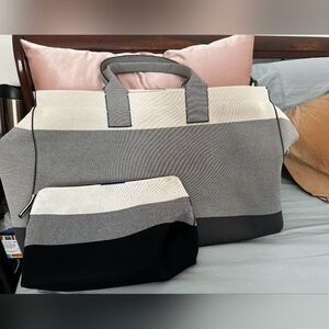 Rothy’s weekender. In Sand Stone, machine washable with original dust bag, laundry bag, and cosmetics bag. Will handle a weekends worth of clothes and compartments for electronics & toiletries. Very chic sizes