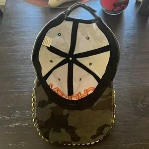 Army Fatigue hat with bold orange letters with gold half bead embellishments.