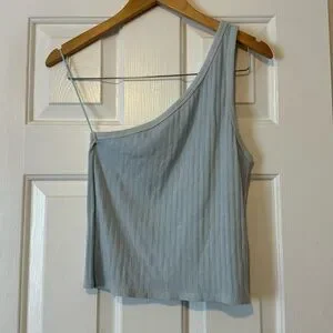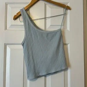 This American Eagle one-shoulder crop tank top is in like-new condition, as it has never been worn. The light blue color is perfect for spring and summer, and the one-shoulder design adds a touch of style. It's made from a comfortable ribbed fabric and is the perfect length for a cropped look.