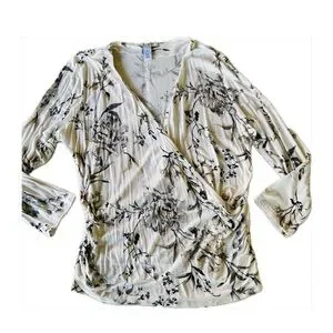 Comfy and cute long sleeved shirt, crossover neck. Great layering top. Shirring detail on the side of shirt. Good condition. See pics for measurements.