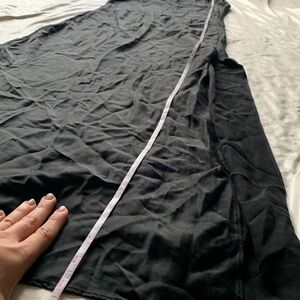 Women’s backless full-length slip dress. Material and size is not listed unfortunately. Confident this is silk, based on it’s similarity to other silk garments I have listed. Could fit a Small or Medium — measurements pictured. Color is black, faintly sheer. Features a-line adjustable spaghetti straps, long slit / vent on the left side. Backless design with a tie-strap. Longest length is 50”. Used, good condition, no significant flaws.