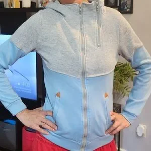 Grey and baby blue light hoodie. Fleece inside. Missing Hood Drawstring. Cool zipper on front