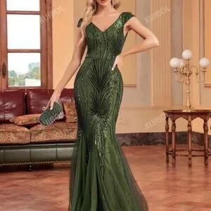 V-neck, sequined on front and back, olive color, size 12/XL, very comfortable, stretchy, fish tail, lined