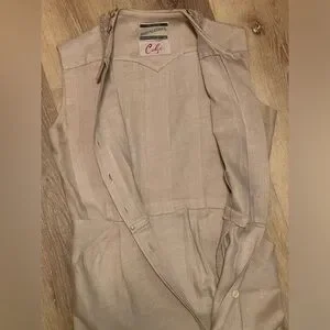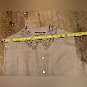 Gorgeous true vintage linen dress. They don’t make them like this anymore! The detailing is impeccable. It features pleating along the bust and in the back, a beaded Peter Pan collar, and buttons down the front. Leave a few undone at the leg if you’re feeling daring. There are invisible belt loops for you to add your favorite belt if desired. Belt not included. EUC though it has a mark near the hem and one button missing (both shown). Please consider pics as part of the description. Feel free to ask questions, as returns are not accepted. Best for a size medium, but please see measurements in pics.