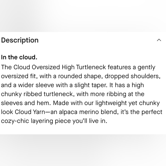 The Cloud Oversized High Turtleneck features a gently oversized fit, with a rounded shape, dropped shoulders, and a wider sleeve with a slight taper. It has a high chunky ribbed turtleneck, with more ribbing at the sleeves and hem. Made with our lightweight yet chunky look Cloud Yarn—an alpaca merino blend, it’s the perfect cozy-chic layering piece you’ll live in.