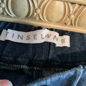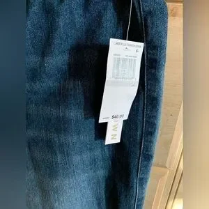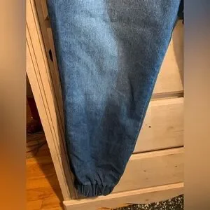 Brand new, has great stretch bottoms are jogger style banded, top is a high rise drawstring , dark denim jeans, no pockets.