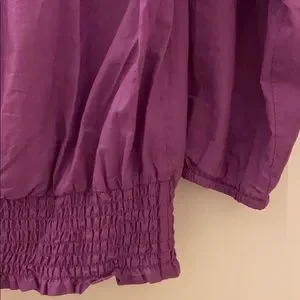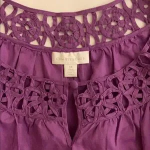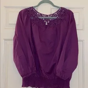 BRAND NEW WITHOUT TAGS CHARTER CLUB blouse in a deep and beautiful purple. The neckline is intricate and feminine and if you take a look at the middle you will see a tiny little button. The end of the 3/4 length arms have a small amount of elastic and it will hold its place on your arm that is most comfortable to you. The hemline also has a wider elastic band to draw attention to those curves of yours. It measures 21” armpit to armpit and is 23.5” in length. Size 14.