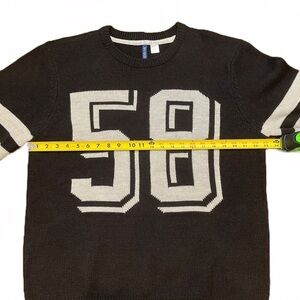 Say hello to football games and sweater weather with this numbered sweater by H&M’s Divided! Black, with white stripes on the sleeves and a white number 58. Made of 15% Wool and 85% Acrylic. Size XL — please see photos for measurements.