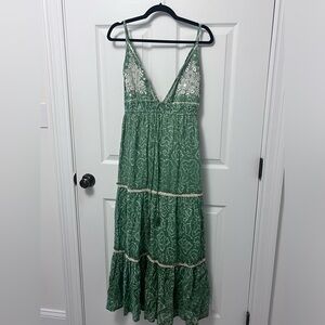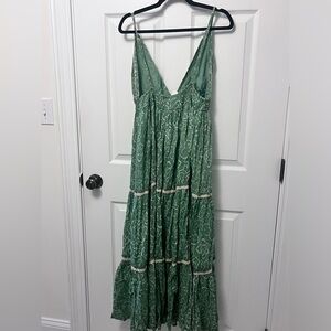This is a gorgeous sequined green dress. It has beautiful elements all over, including intricate sequined work over the chest and gold thread woven throughout. It is boho style and lined. It has tassel accents. Would be perfect as a pool cover up. New with tags - originally purchased in a local Indian clothing shop.