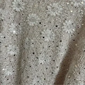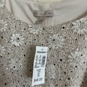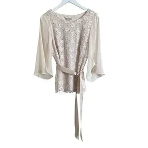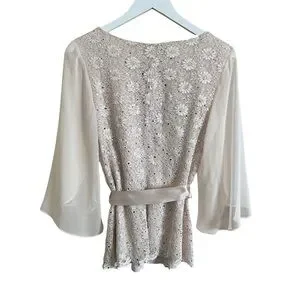 Cream dressy blouse belted sequins lace flowing sleeves.