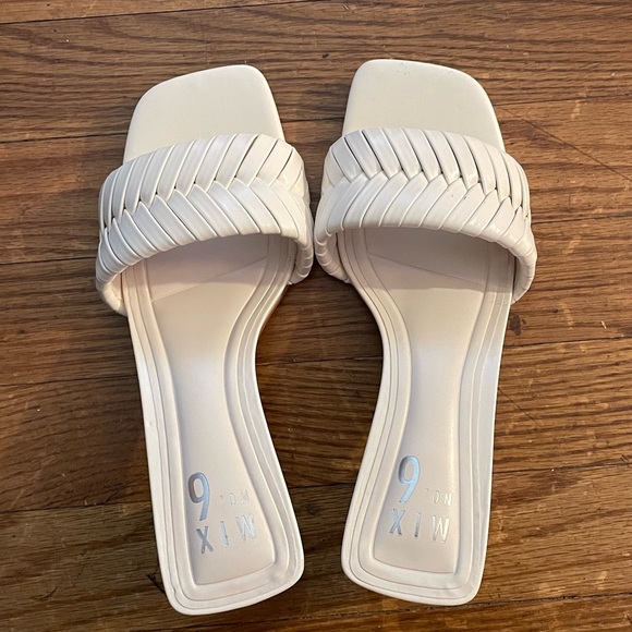 NWT Mix No. 6 slip on sandals with square toe, kitten heel, square toe, woven strap , 2.5 block heel, woven strap design