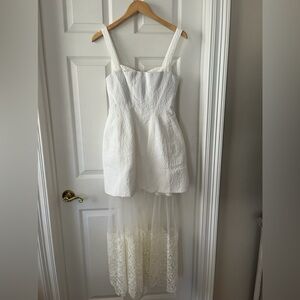 Runs true to size. Ordered for my rehearsal dinner but did not come in time. A striking white dress with tiered ruffled embellishments and a sweetheart neckline. Removable skirt for perfect change into mini dress.