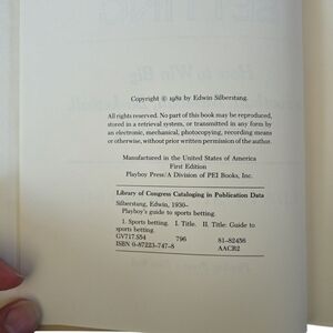 PLAYBOY'S Guide to Sports Betting hardcover book by Edwin Silberstang. Copyright 1982. First edition. Playboy Press 336 pages. In great vintage condition. The jacket cover has 2 tears on the front. Please enlarge all photos to see condition