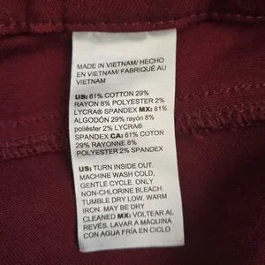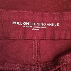 Chico's Cranberry Pull On Jegging Ankle Pants. Chico's size 3R (16R) Super comfortable. The beautiful Cranberry color shows better in the pictures of the folded pants and tags. 40" waist, 42" hips and 27" inseam. In great used condition