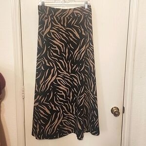 This is a cute fall skirt. The print reminds me of an animal print. It is a midi length with a wide waistband. The label says no size, but it fits like a medium. This skirt is new and has never been worn.