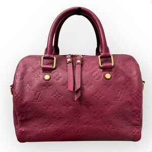 Authentic LOUIS VUITTON Monogram Empreinte Speedy Bandouliere 25 in Aurore. This stunning Speedy style tote is crafted of Louis Vuitton monogram embossed deep burgundy. The bag features rolled leather top handles and a shoulder strap with polished brass hardware including a brass zipper and leather zipper pull that fits a brass padlock. The top zipper opens to a matching striped fabric interior. This is an excellent tote, ideal for everyday use.