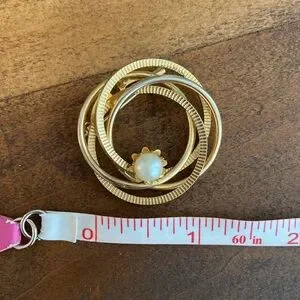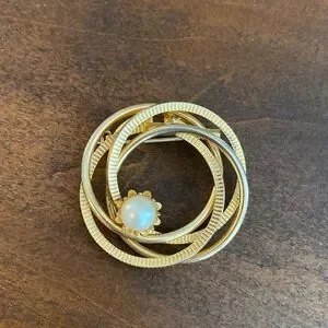 Pretty gold tone vintage brooch with intertwined circles and a faux pearl. Pin closure in back. Good condition. Measures about 1.25β across.