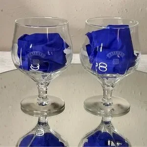 BAILEYS IRISH CREAM LIQUEUR STEMMED TULIP GLASSES WHITE ETCHING-6 OZ~SET OF 2. Glasses are approximately 4” tall and 2.5” wide. See all photos they are part of description.