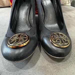 Black leather Tory Burch Wedges. Used but have a lot of life left. Good condition with some flaws (please see photos). Very comfortable and cute.
