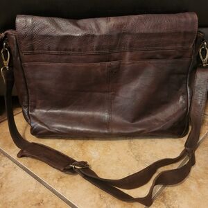 NWOT brown leather messenger bag measuring 16.5" width x 10" height x 4" depth, this bag is equipped with an outer pocket suitable for keeping an iPad and other essential items,fits laptop of up to 17". Featuring a spacious interior layout,1 large laptop compartment, 1 smaller section, and 3 pockets at the front for phones and other accessories. There are 2 zipper pockets, including 1 located at the back. See pictures for condition and style.