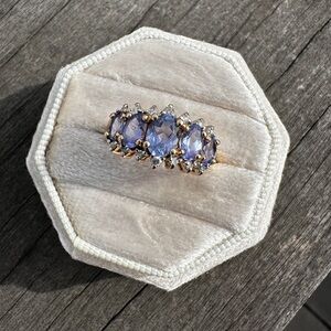 Stunning ring! 5 Tanzanites set in 14K gold with diamonds. Absolutely beautiful!!! Split shank setting. Let me know what color box you’d like. I’ll try and accommodate!