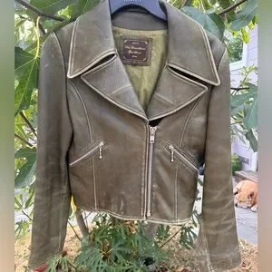 This stylish, ultra supple cropped moto leather jacket by What Goes Around Comes Around (from when the brand went by What Goes Aroubd Comes Around circa 2005) features a soft olive green color, perfect for adding a pop of color to your outfit. Chunky silver zipper hardware at pockets and cuffs. Well loved with and lots of patina make this really special.