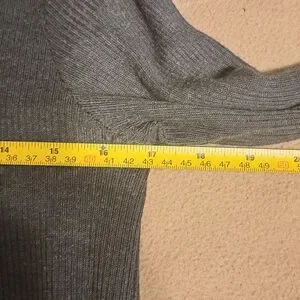 A versatile knee-length sweater dress in charcol with a scoop neck and long sleeves, perfect for casual or work occasions. I tried to get good pictures of the design of the ribbing. It runs over the shoulders and down the sides and sleeves. The design is so figure flattering. 90% acrylic and 10% wool this detest is really warm and comfy.