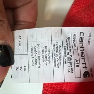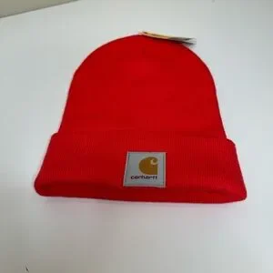 Carhartt Knit Cuffed Beanie NEW, with tags Color: red/orange, One size fits all. can be used by men or women Originally designed as a workwear essential, it can now be found at construction sites and campgrounds, state fairs and football stadiums. Previously known as the Acrylic Watch Hat Features 100% acrylic rib knit Fold-up cuff with Carhartt patch.
