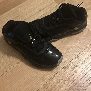 These are the talk of the playground. Black with gold accents. Bottom soles are in great shape. Missing original inner soles. Small bit of fraying on right shoe right at the lace. So much life is left in these. Jordan logo still very clear on bottom of shoe to show how little they’ve been worn.
