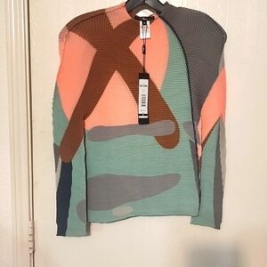 You will be beautiful in this chic and unique minty green, pink, brown, and gray outfit by For Her. Brand new with tags. The skirt has beautiful pleats and a wide pull on waistband. The top has a lot of stretch for a large bust. Heads will turn when you wear this uniquely chic outfit. What color shoes will you be rocking with your new outfit?