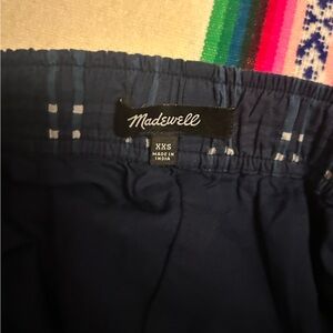 Super cute navy blue plaid a-line skirt by Madewell. 100% cotton. Fully lined. Elastic waist allows it to fit small or medium. Cute ruffle detail at hips. This skirt is so flattering and perfect for Fall with a pair of tall boots or mid calf boots with white knee high socks.