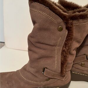 Naturalizer suede boots with fur lining and trim. Leather uppers, faux fur. Pull on, no zipper. Buckle on the side. Thick wedge rubber soles 1” to 2”. Very good condition.