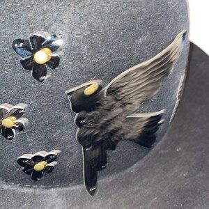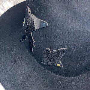 Wide, flat brim fedora hat with stylish bird patches. Snakeskin sweatband. Adjustable sweatband for a secure and comfortable fit. 100% wool