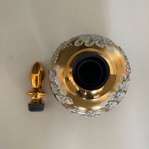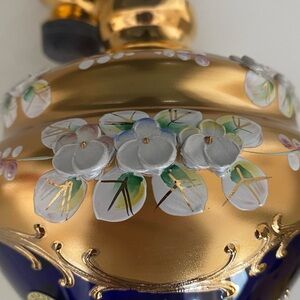 Petite and pretty perfume bottle. This small, lobed, blue glass bottle has plenty of charm. The flowers and accents are hand painted in gold, white and green enamel. The bottle with stands 6.5" tall and is 4" wide. Made in the Czech Republic.