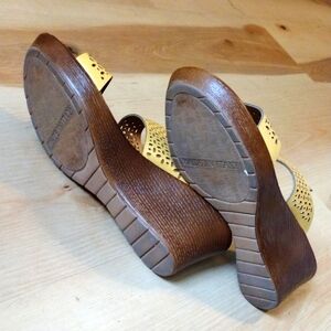 Italian shoemakers genuine leather two strap wedge shoes. size 9 medium width. leather color is an okra. lightweight shoe. used good condition only very minor marks