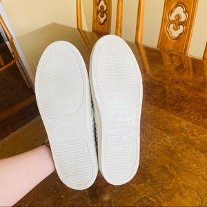 very very minor discoloring, not noticeable, great condition. woven leather tennis shoes