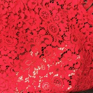 Express, size M, coral red turtleneck lace crop top. Worn and in excellent condition. 43 percent nylon 35 percent cotton 22 percent viscose. Zipper closure in the back.