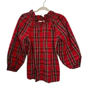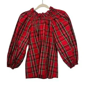 J Crew Smocked-neck Top in Good Tidings Holiday Red Plaid Blouse Balloon Sleeve