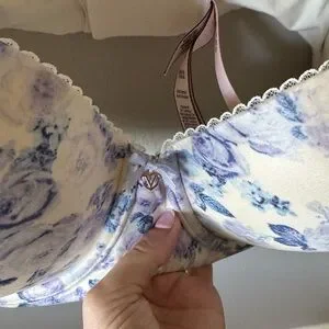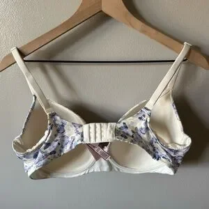 Body by Victoria, Victoria’s Secret Bra- size 38DD. Blue and purple floral design on a cream color white. Underwire, adjustable straps, and smooth cups. Worn once and in like new condition!