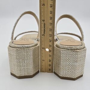 These open-toe stunners boast a solid block heel that offers both stability and the perfect amount of lift. They are swathed in a textured fabric from top to toe, mimicking the finest natural weaves to bring an organic, artisanal vibe to your look. Each detail, from the upper that is completely covered in this rich material to the braided straps laced with metallic threads, adds a layer of visual intrigue and tactile texture to your stride.