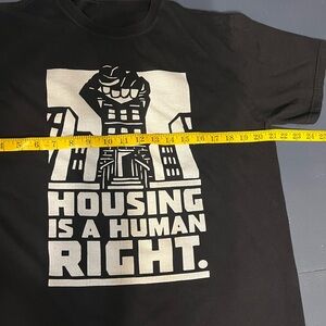 Large black 100% organic cotton shirt. Made by Econscious. Housing is a human right message with a powerful fist. Great condition and made with thick and durable material. Support the cause!