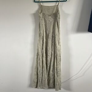This maxi dress features a flowy fit. It has a non-stretchy material and thin adjustable shoulder straps. The maxi dress has embroidery detail and a lining. This maxi dress comes in light green.